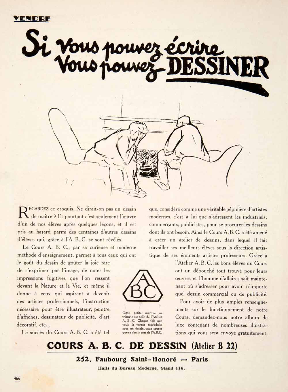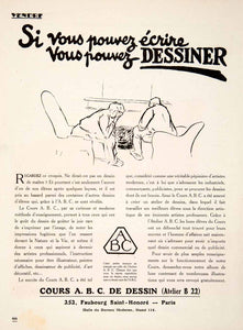 This is an original 1924 black and white print ad for drawing classes, Cours A.B.C. de Dessin, held in Atelier B 22 at 252 Faubourg Saint-Honoré, Paris.