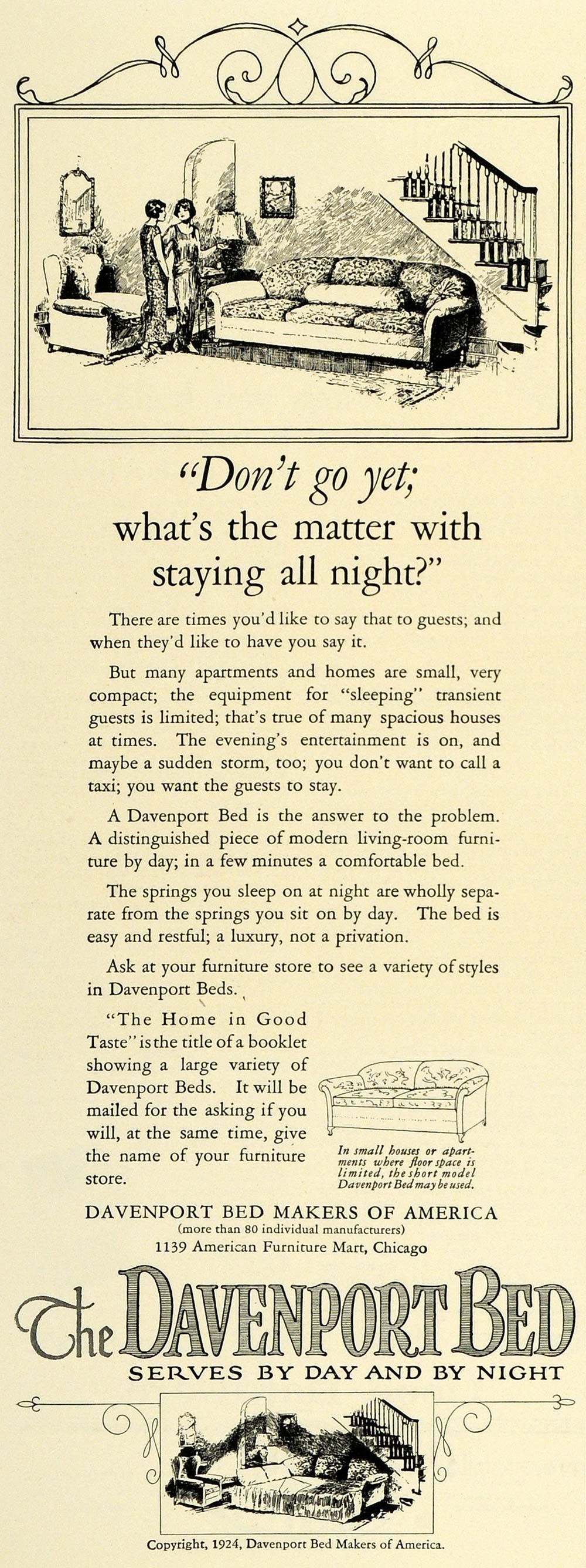 This is an original 1924 black and white print ad for the Davenport Bed, a product by the Davenport Bed Makers of America, located at 1139 American Furniture Mart in Chicago.