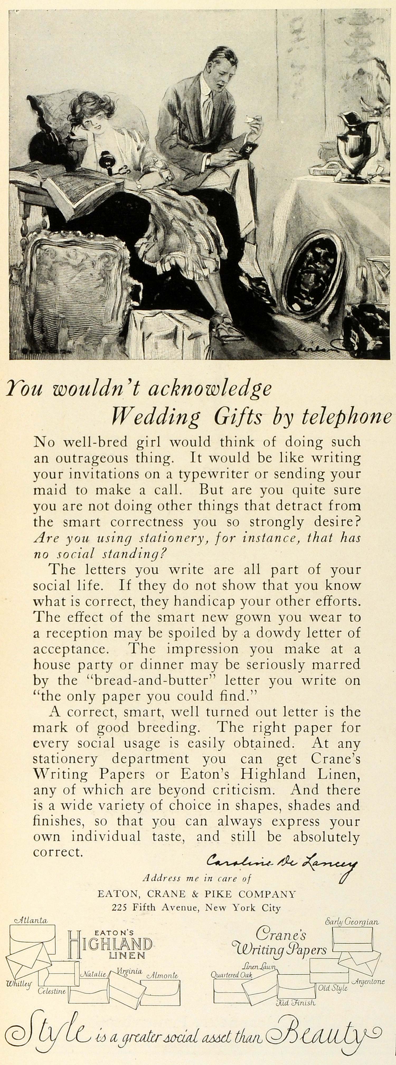 This is an original 1924 black and white print ad for the Eaton, Crane and Pike Company, located at 225 Fifth Avenue in New York City.