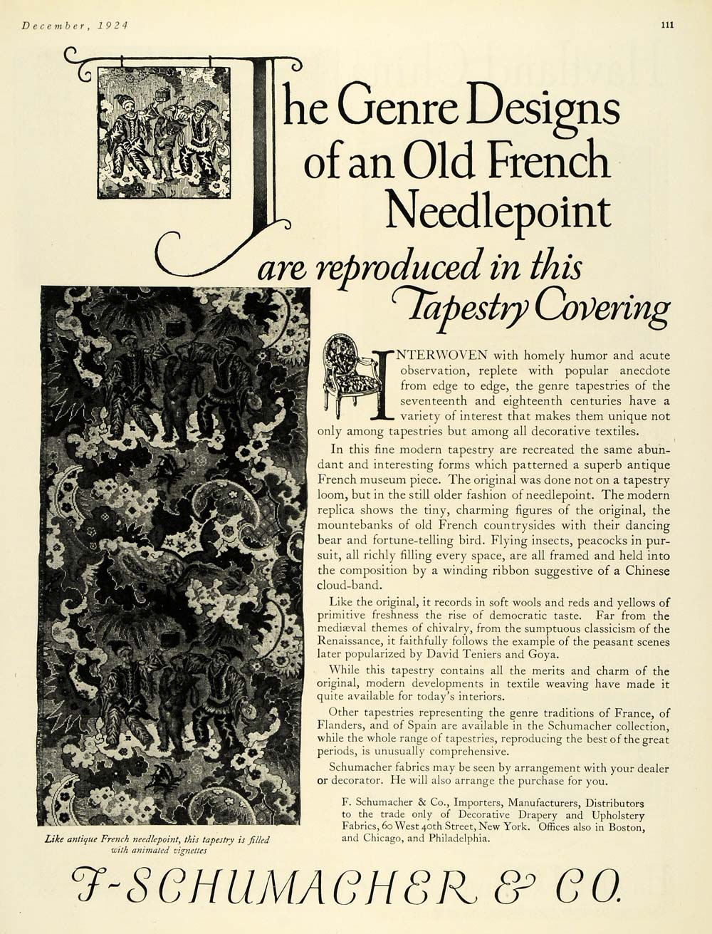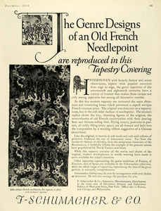 This is an original 1924 black and white print ad for F. Schumacher and Company. The ad features an image of a tapestry with several animals and people in it.