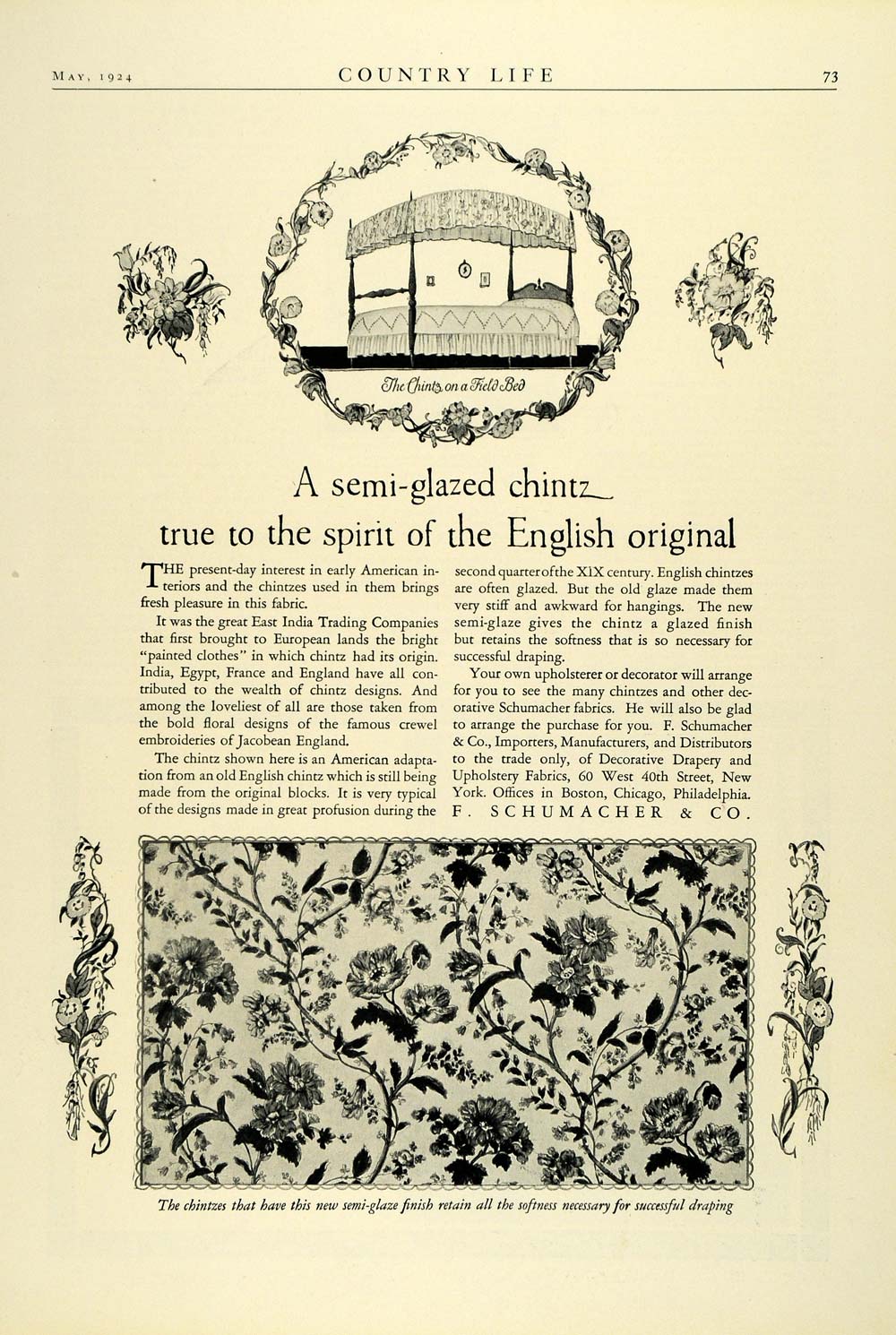 This is an original 1924 black and white print ad for English semi-glazed chintz and other household decor by F. Schumacher and Company, located at 60 West 40th Street in New York.