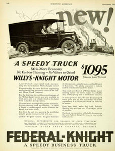 This is an original 1924 black and white print ad for Federal-Knight Speedy Business Trucks from the Federal Motor Truck Company of Detroit, Michigan featuring Willys-Knight motors.