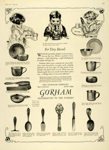 This is an original 1924 black and white print ad for the Gorham Company of Providence, New York. This ad features their dinner silverware for children at mealtime.