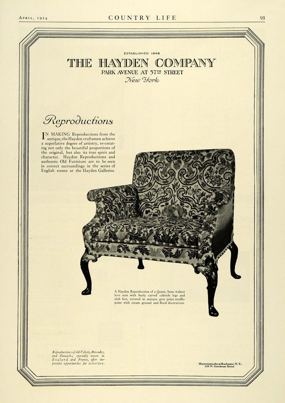 This is an original 1924 black and white print ad for furniture reproductions and other household decor and furnishings by The Hayden Company, located on Park Avenue at 57th Street in New York. This particular ad features an image of a Hayden reproduction of a Queen Anne walnut love seat with carved cabriole legs and club feet and covered with needlepoint upholstery.