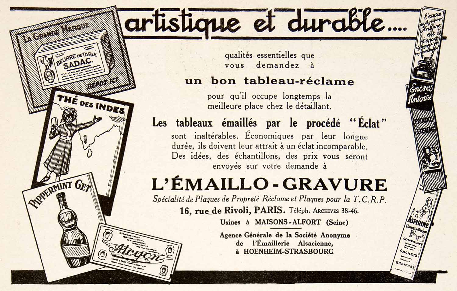 This is an original 1924 black and white print ad for the enameled signs created by L'Emaillo-Gravure, located at 16 rue de Rivoli, Paris.