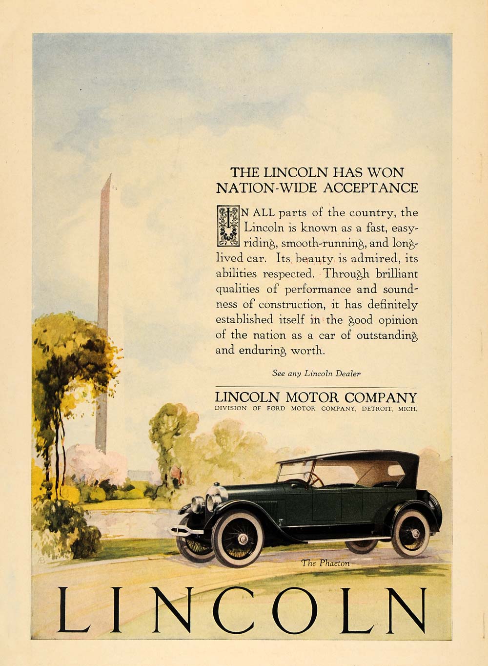 Keywords specific to this image: dealer, vehicle, automotive, body, model, green, park, patriotic, America, Washington, D. C., ride, riding, drive, driving, cab, greenery, scenery, scenic, Monument, landmark Vintage Advertising