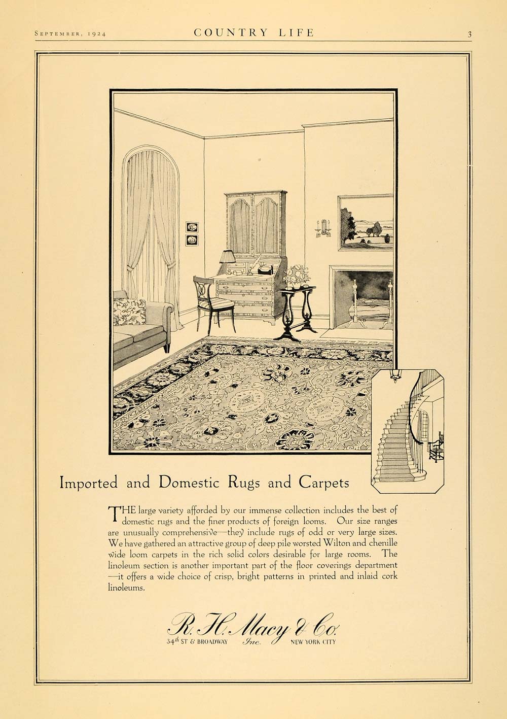 This is an original 1924 black and white print ad promoting domestic rugs and carpets from R. H. Macy & Company located at 34th Street and Broadway, New York.