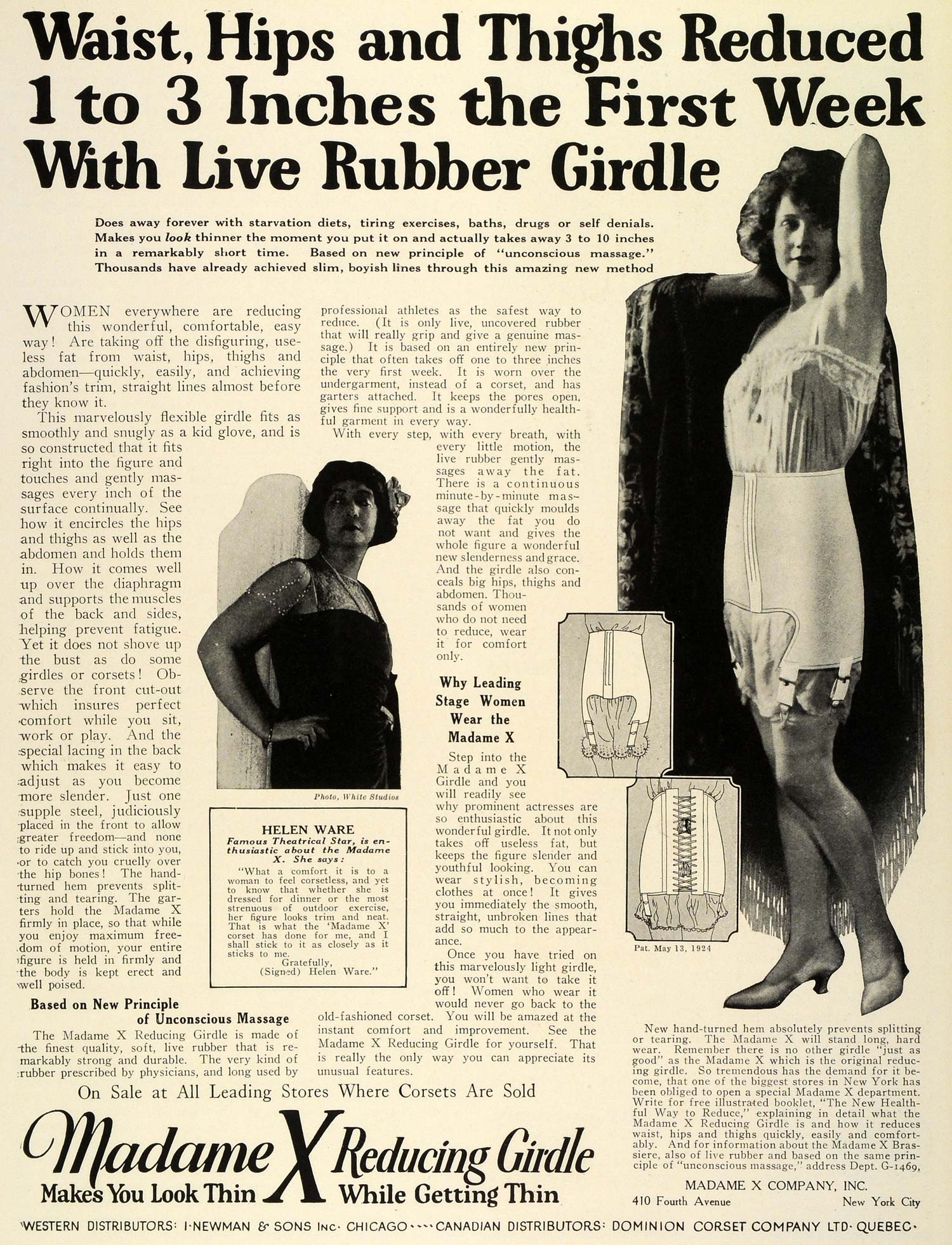 This is an original 1924 black and white print ad for the Madame X Reducing Live Rubber Girdle for women. This ad features a celebrity testimonial by American stage and film actress Helen Ware.