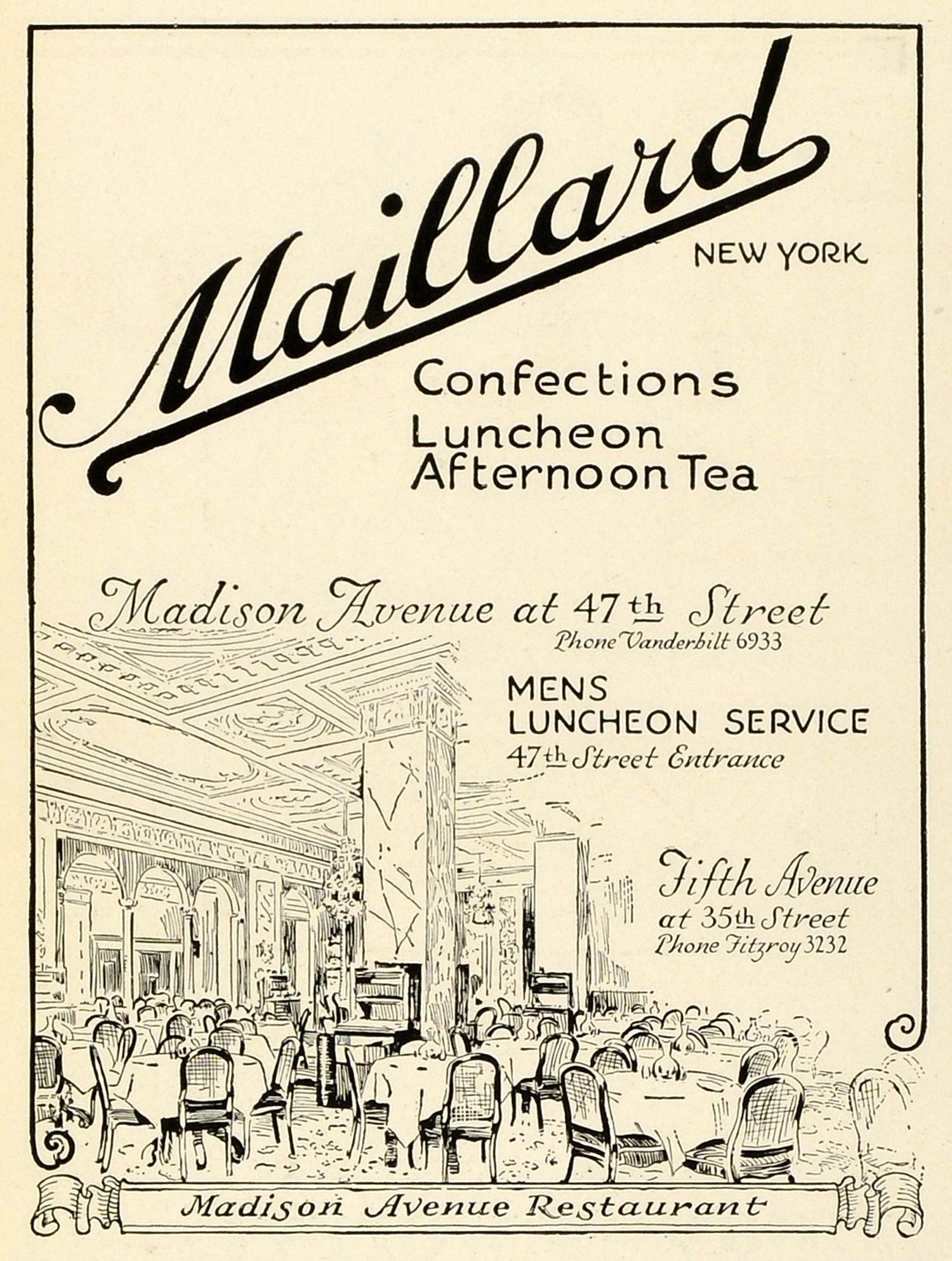 This is an original 1924 black and white print ad for Maillard of Madison Avenue at 47th Street as well as Fifth Avenue at 35th Street in New York; this ad features their confections, desserts, luncheons, and afternoon teas.
