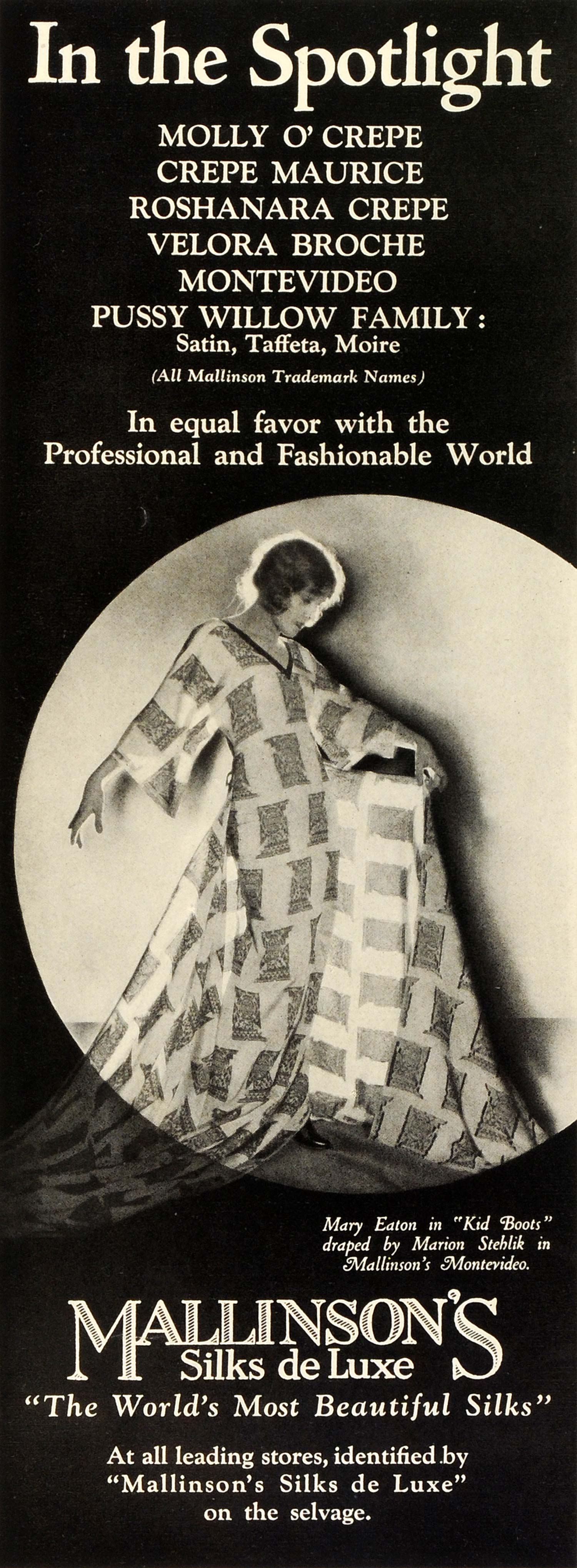 This is an original 1924 black and white print ad for Mallinson's Silks de Luxe, specially featuring stage actress, singer and dancer Mary Eaton in who starred in the play "Kid Boots." Eaton was draped by Marion Stehlik in Mallinson's Montevideo fashion.