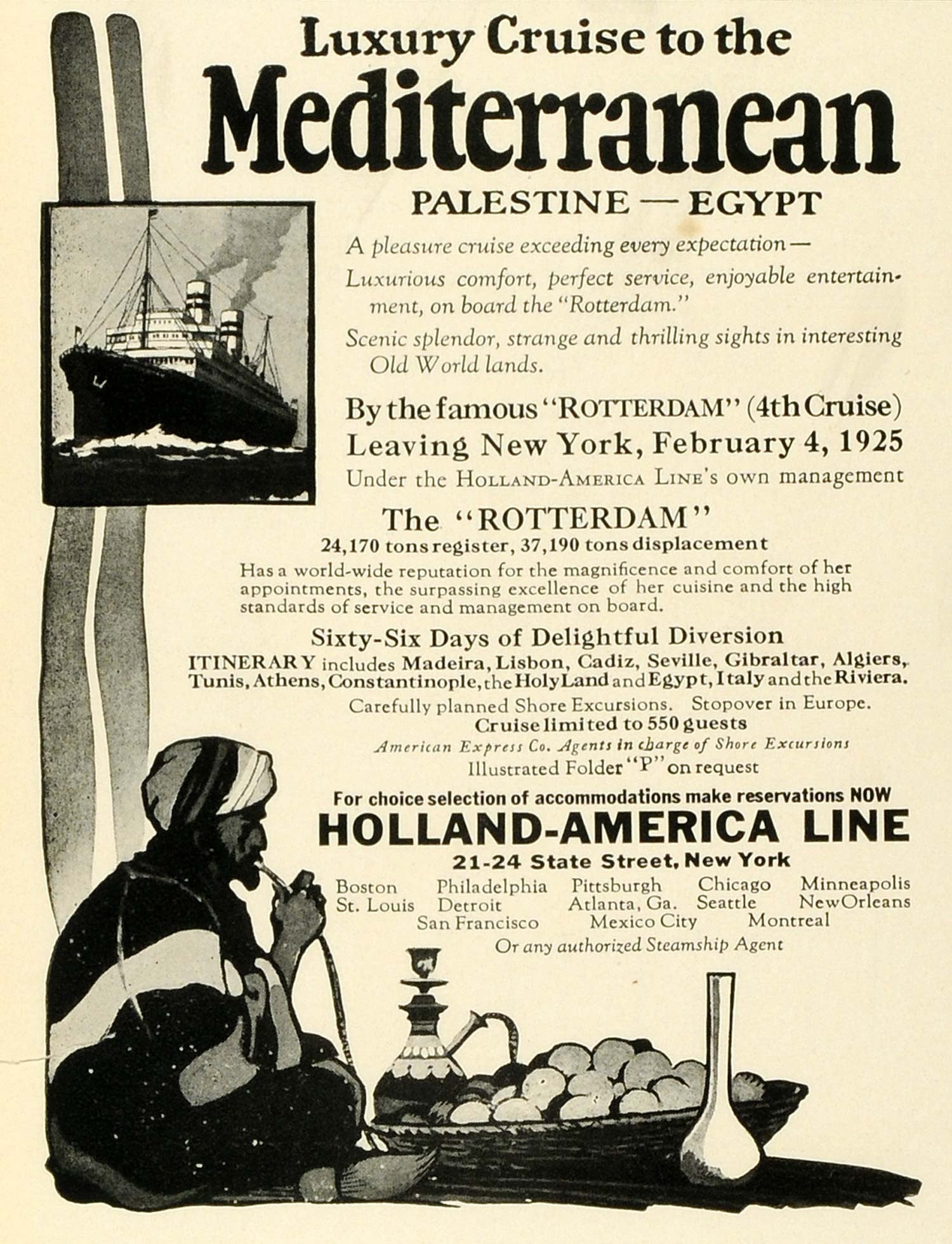 This is an original 1924 black and white print ad for luxury cruises to the Mediterranean, including Palestine and Egypt via the "Rotterdam" ship of the Holland America Line.
