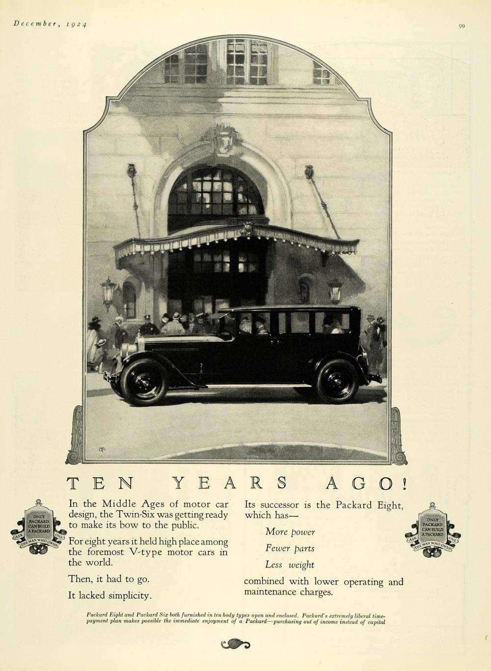 This is an original 1924 black and white print ad for the Packard Eight and Packard Six. The ad writes, "In theMiddle Ages of motor car design, the Twin-Six was getting ready to make its bow to the public..."