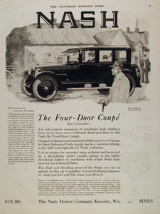 This is an original 1924 black and white print ad for the Nash Six Four-Door Coupe automobile. The ad is illustrated with an image of the home of Lawrence Washington, ancestor of George Washington, in the village of Little Brington, England. It was drawn especially for Nash by Mount, the noted English artist. The Nash Motors Company, Kenosha, Wisconsin.