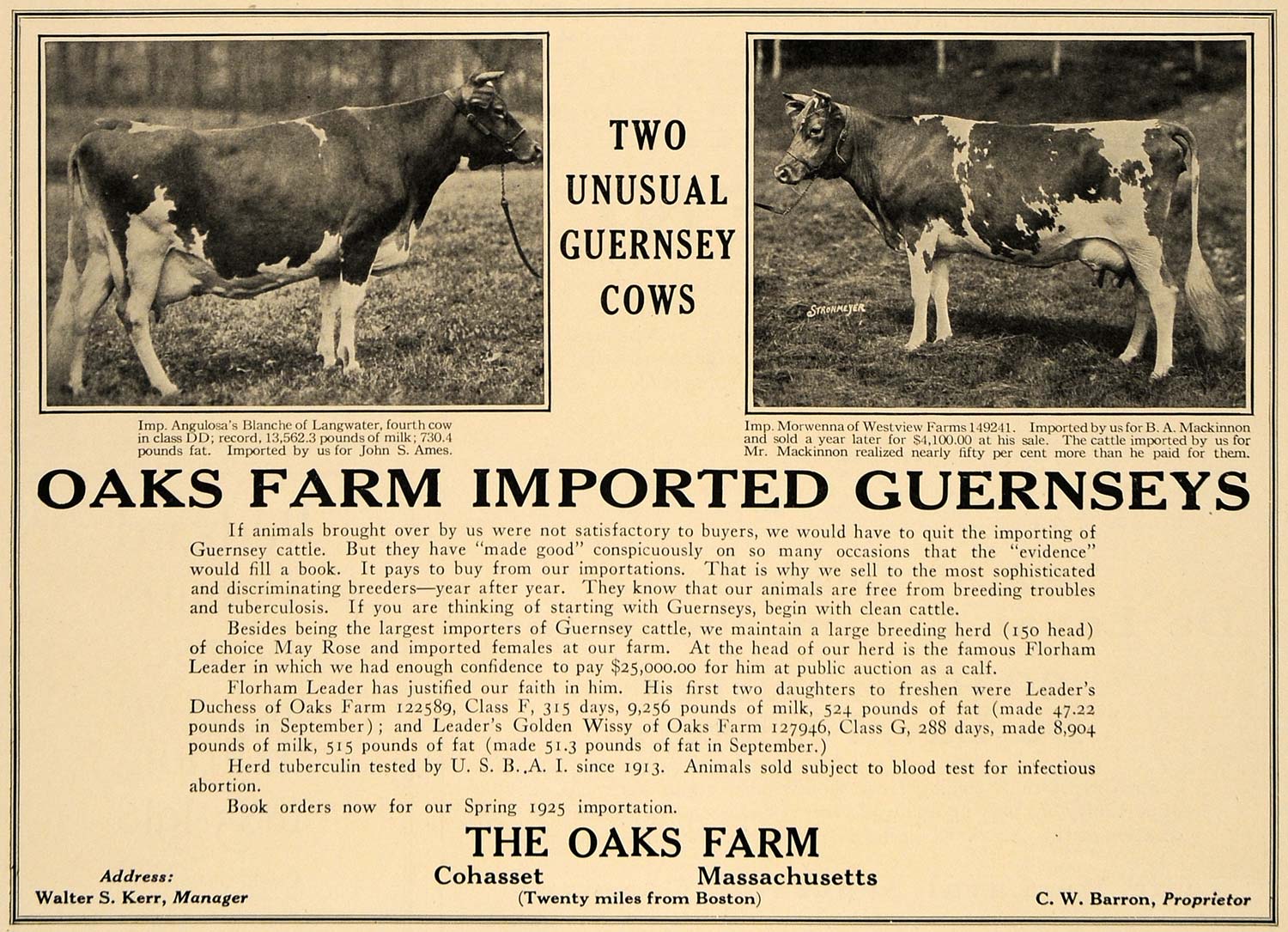 This is an original 1924 black and white print ad for Oaks Farm imported Guernseys by Walter S. Kerr (manager) and C. W. Barron (proprietor), located in Cohasset, Massachusetts.