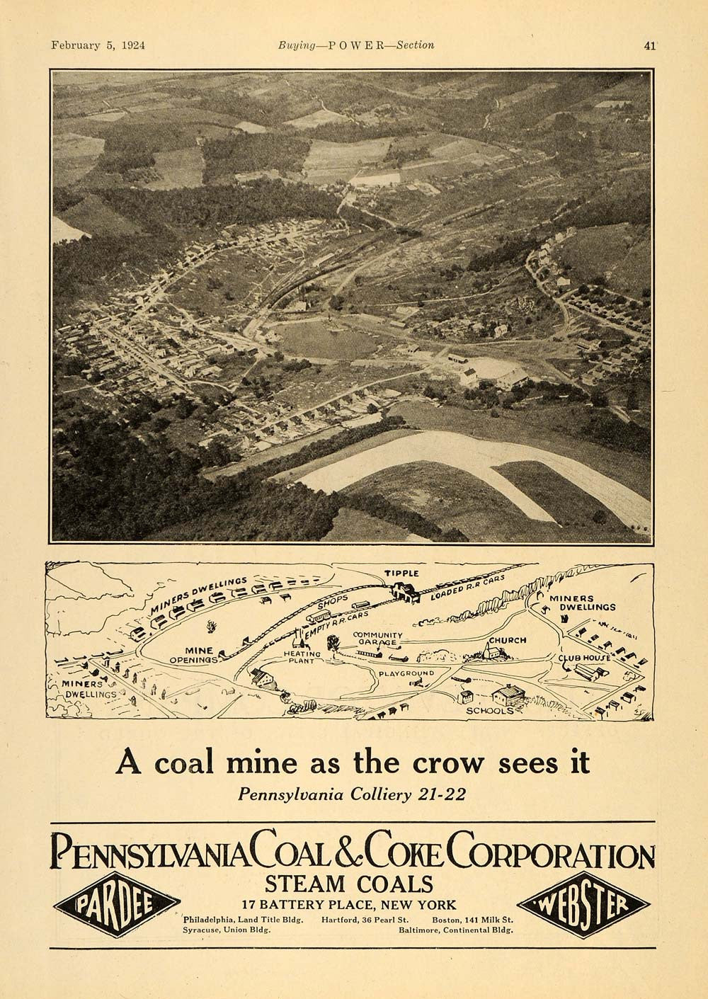 This is an original 1924 black and white print ad for Pennsylvania Coal & Coke Corporation located at 17 Battery Place, New York, NY.