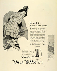 This is an original 1924 black and white print ad for Pointex Onyx Hosiery for women. This ad features artwork by John R. Holmgren.