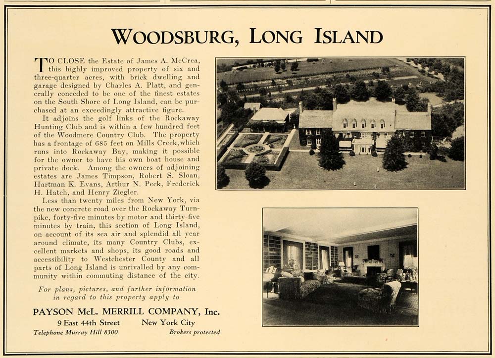 This is an original 1924 black and white print ad for Real Estate Property in Woodsburg, Long Island from the Payson McL. Merrill Co. located at 9 East 44th Street, New York.