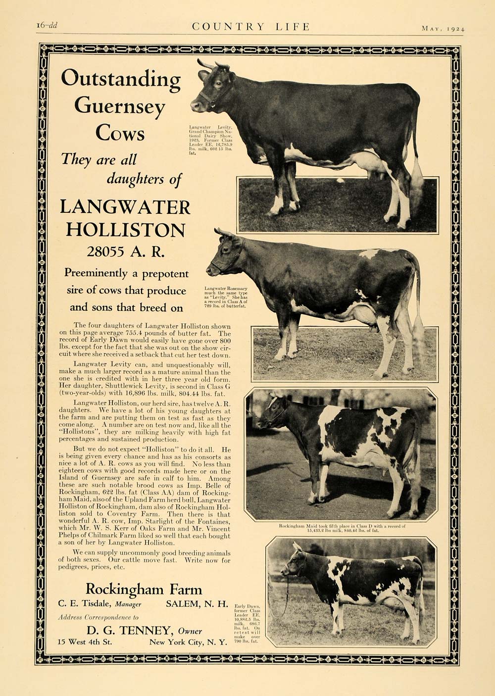 This is an original 1924 black and white print ad for Rockingham Farm of Salem, New Hampshire. This farm is owned by D. G. Tenney of 15 West 4th Street in New York City; this farm is managed by C. E. Tisdale. This ad features Rockingham's Guernsey cows, all daughters of Langwater Holliston.