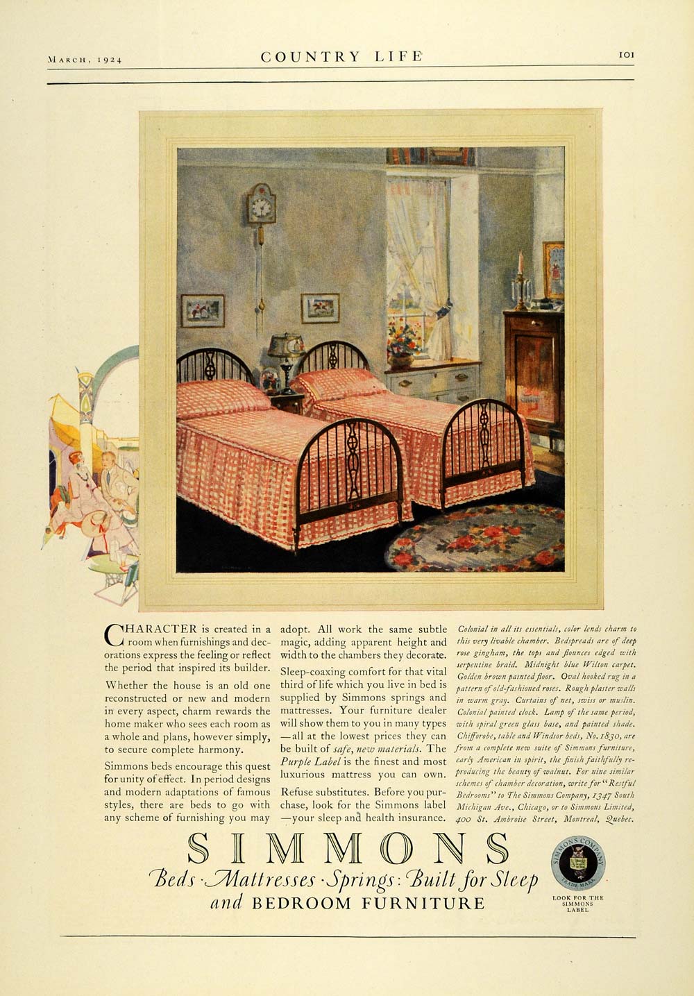 This is an original 1924 color print ad for bedding by The Simmons Company, located at 1347 South Michigan Avenue in Chicago.