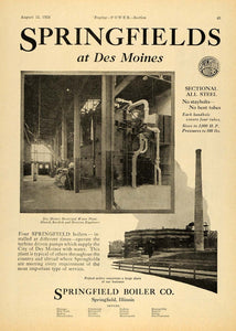 This is an original 1924 black and white print ad for Springfield Boiler Co. located in Springfield, Illinois. Pictured in the ad is the Des Moines Municipal Water Plant, Alvord, Burdick and Howson, Engineers.