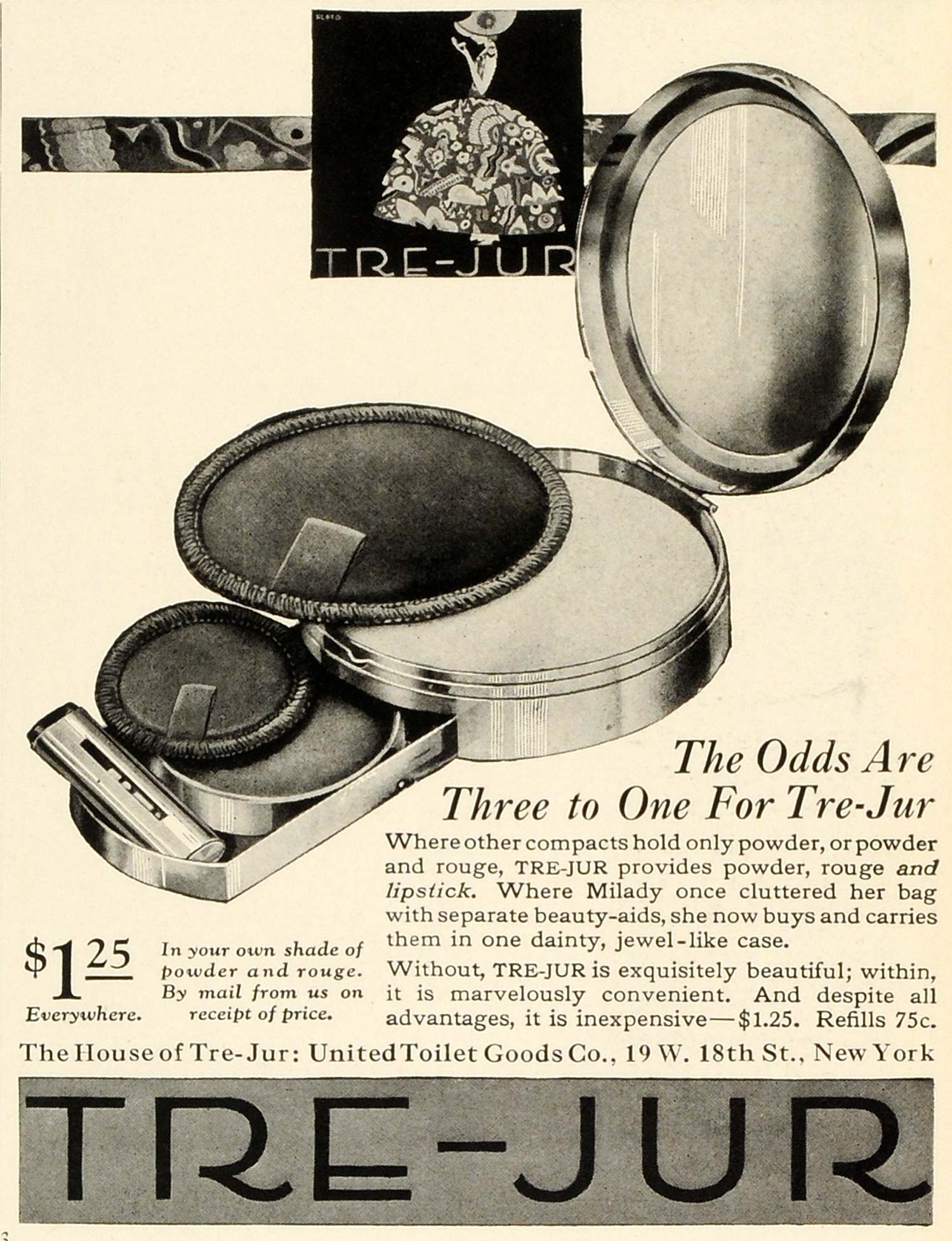 This is an original 1924 black and white print ad for the Tre-Jur cosmetics compact, a product by The House of Tre-Jur: United Toilet Goods Company, located at 19 W. 18th Street in New York.