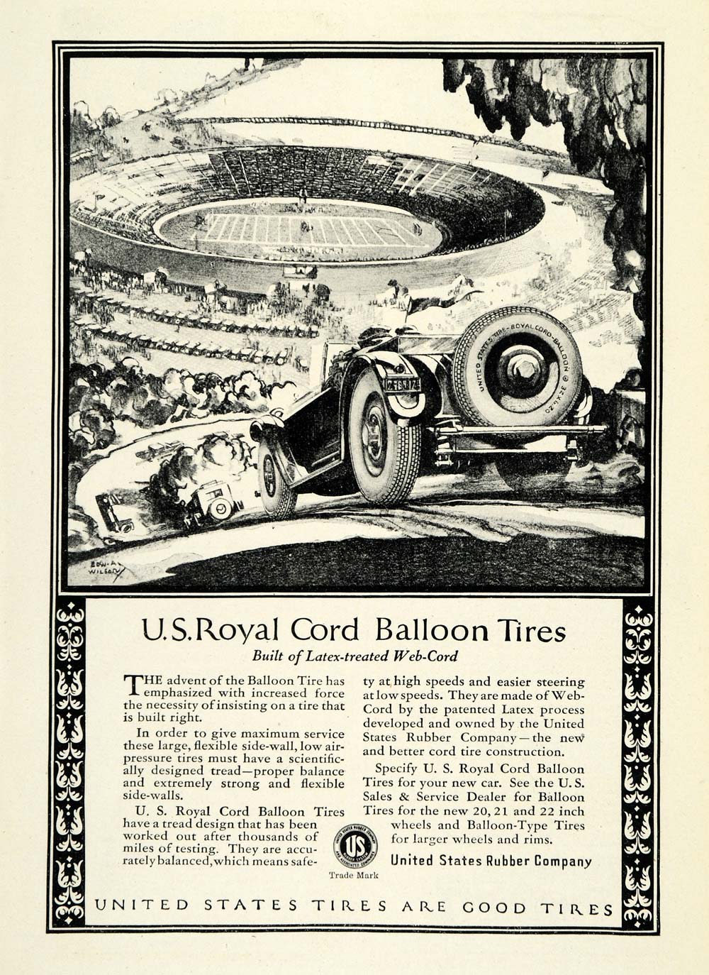 This is an original 1924 black and white print ad for U. S. Royal Cord Balloon Tires, built of Latex-treated Web-Cord, a product by the United States Rubber Company.