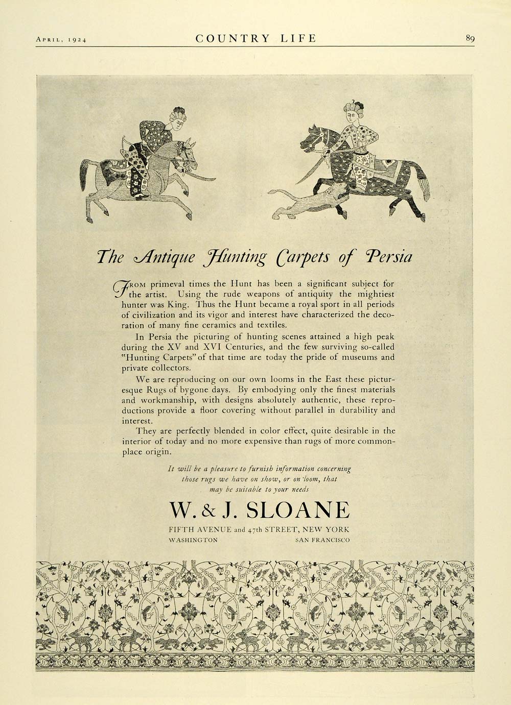 This is an original 1924 black and white print ad for Antique Hunting Carpets of Persia from W. & J. Sloane, located on Fifth Avenue and 47th Street in New York.