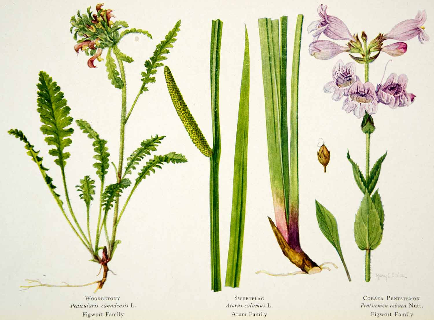 This is an original 1924 color print of Woodbetony and Cobaea Pentstemon of the Figwort Family, as well as Sweetflag of the Arum Family.