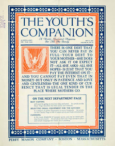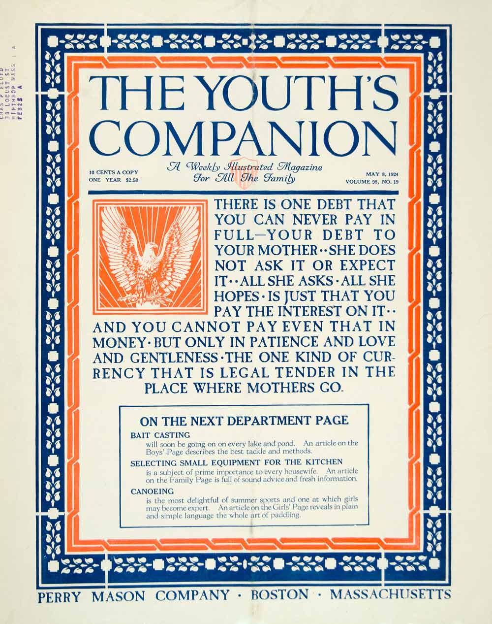 This is an original 1924 two-color cover for The Youth's Companion magazine, May 8,1924, that features a quote about Mother's Day that reads; "There is one debt that you can never pay in full - your debt to your mother. She does not ask it or expect it. All she asks, all she hopes, is just that you pay the interest on it. And you cannot pay even that in money, but only in patience and love and gentleness. The one kind of currency that is legal tender in the place where mothers go."