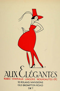 This is an original 1924 three-color lithograph of a poster, designed by Aldo Cosomati in 1923, advertising Aux Elégantes at Old Brompton Road, London.