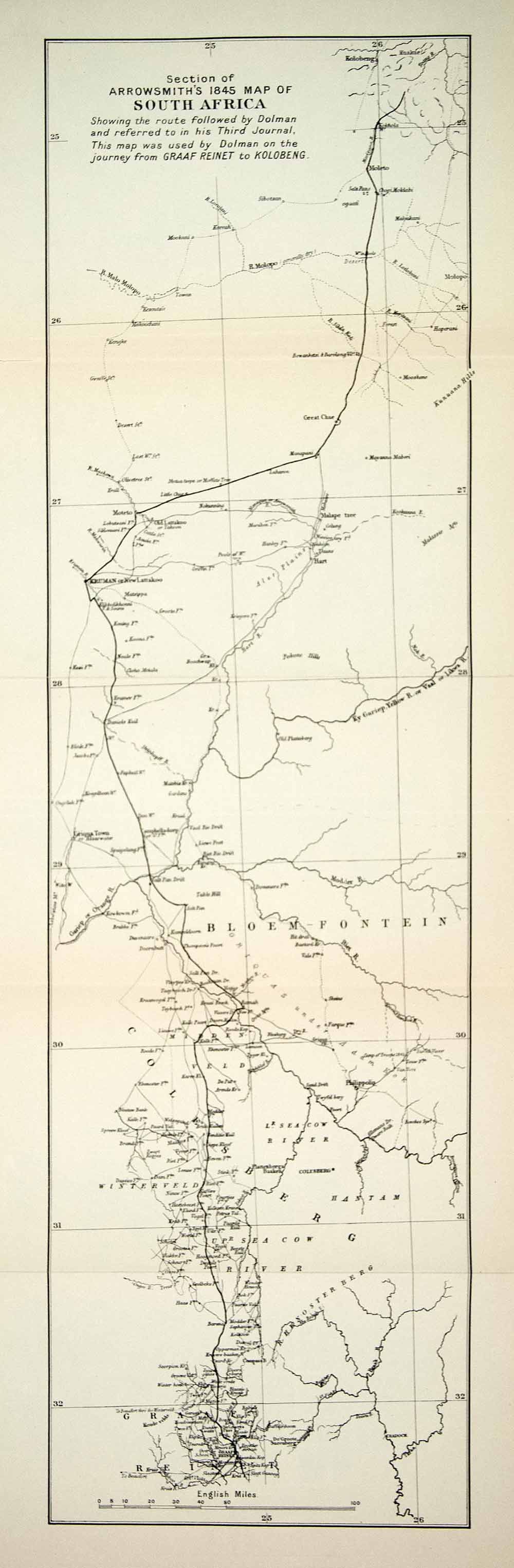 This is an original 1924 monochrome lithographed map of "A Slection of Arrowsmith's 1845 Map of South Africa, Showing the route followed by Dolman." This is an exquisite map of a section of southern Africa.