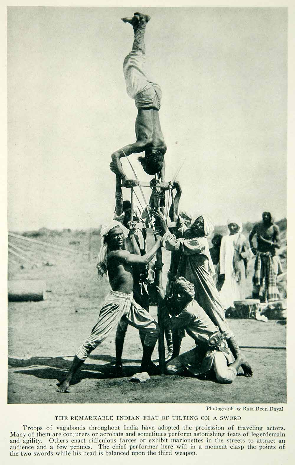 This is an original 1924 duotone halftone print of Indian acrobats performing the exciting activity of tilting on a sword.