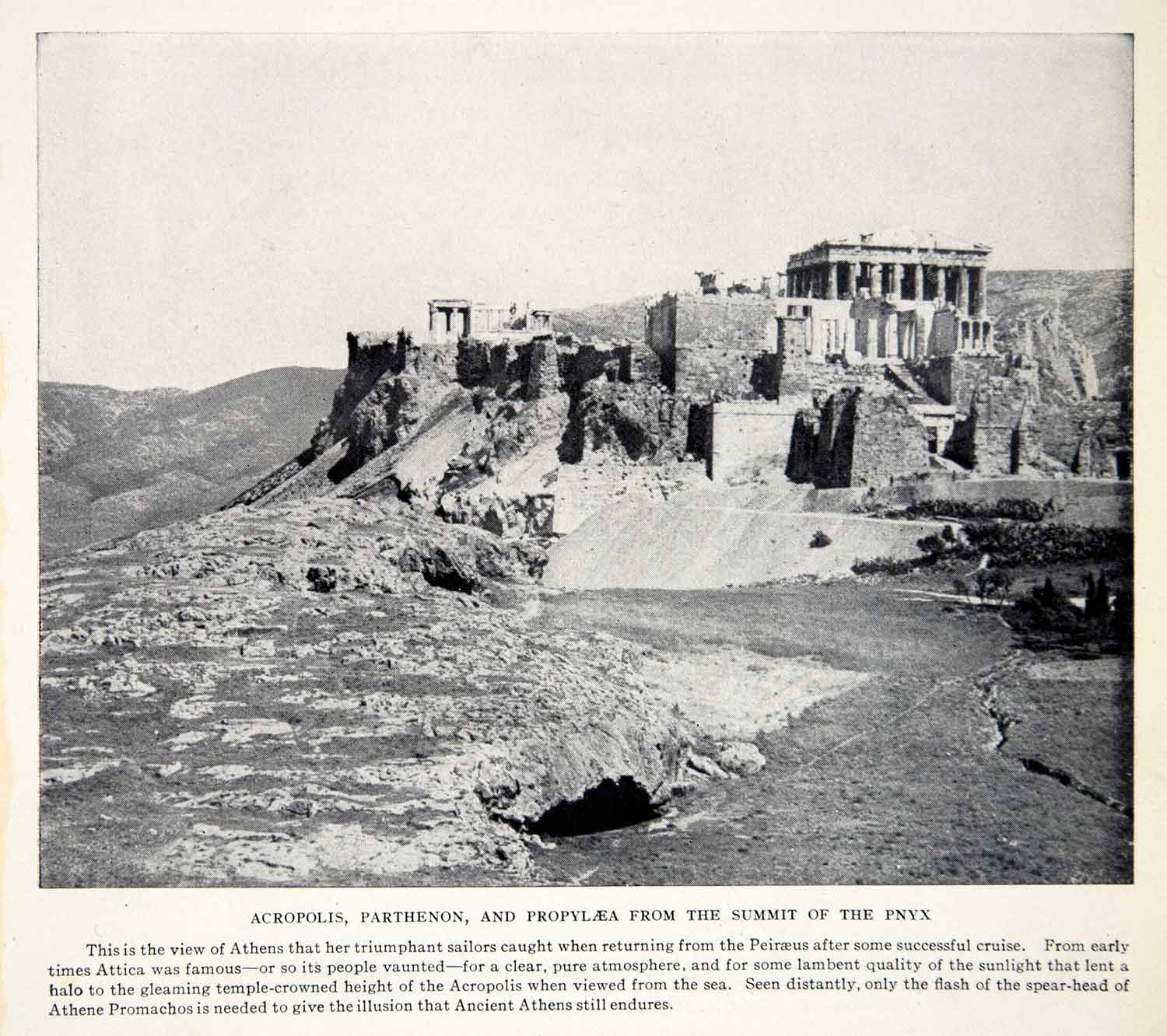 This is an original 1924 black and white halftone print of the "Acropolis, Parthenon, and Propylaea from the Summit of the Pnyx.