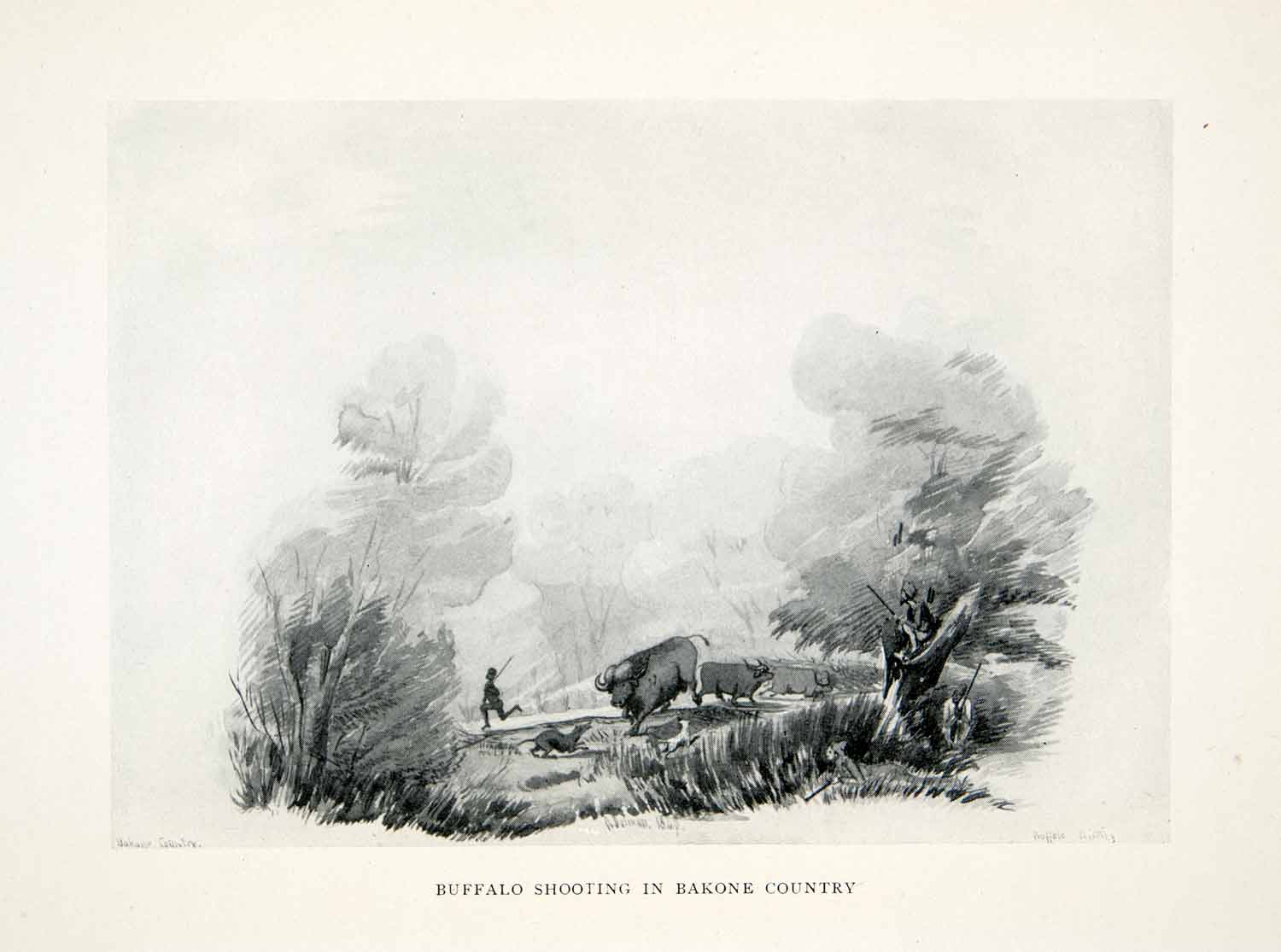 This is an original 1924 black and white halftone print of "Buffalo Shooting in Bakone Country."