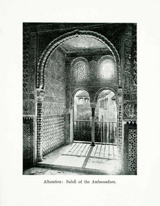 This is an original 1924 black and white halftone print of a palace and fortress called Alhambra in Andalusia, Spain.