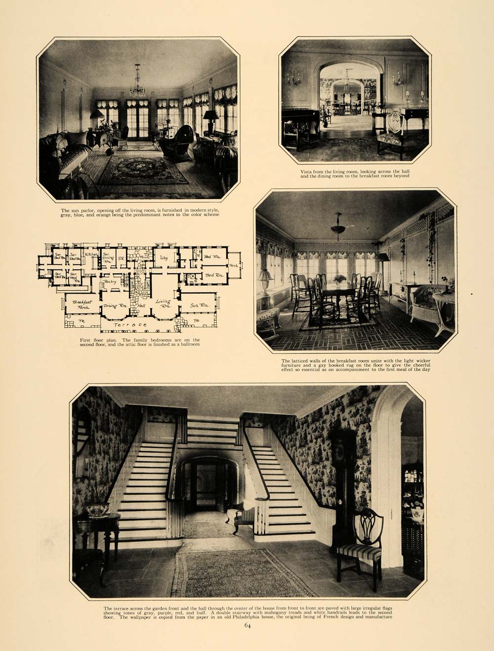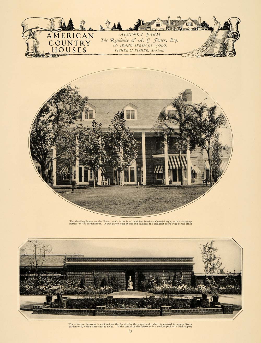 This is an original 3 page 1924 halftone print of Alcynka Farm-- the home of A. C. Foster in Idaho Springs, Colorado. The architects for the building were Fisher & Fisher. Featured are images of the dwelling house in a Southern Colonial style, the entrance forecourt, the sun parlor, the living room, the breakfast room, the terrace, the bedroom, the Sheraton furniture, and the decor. Please see additional images and note that the 3 pages are printed on 2 pages-- front and back.