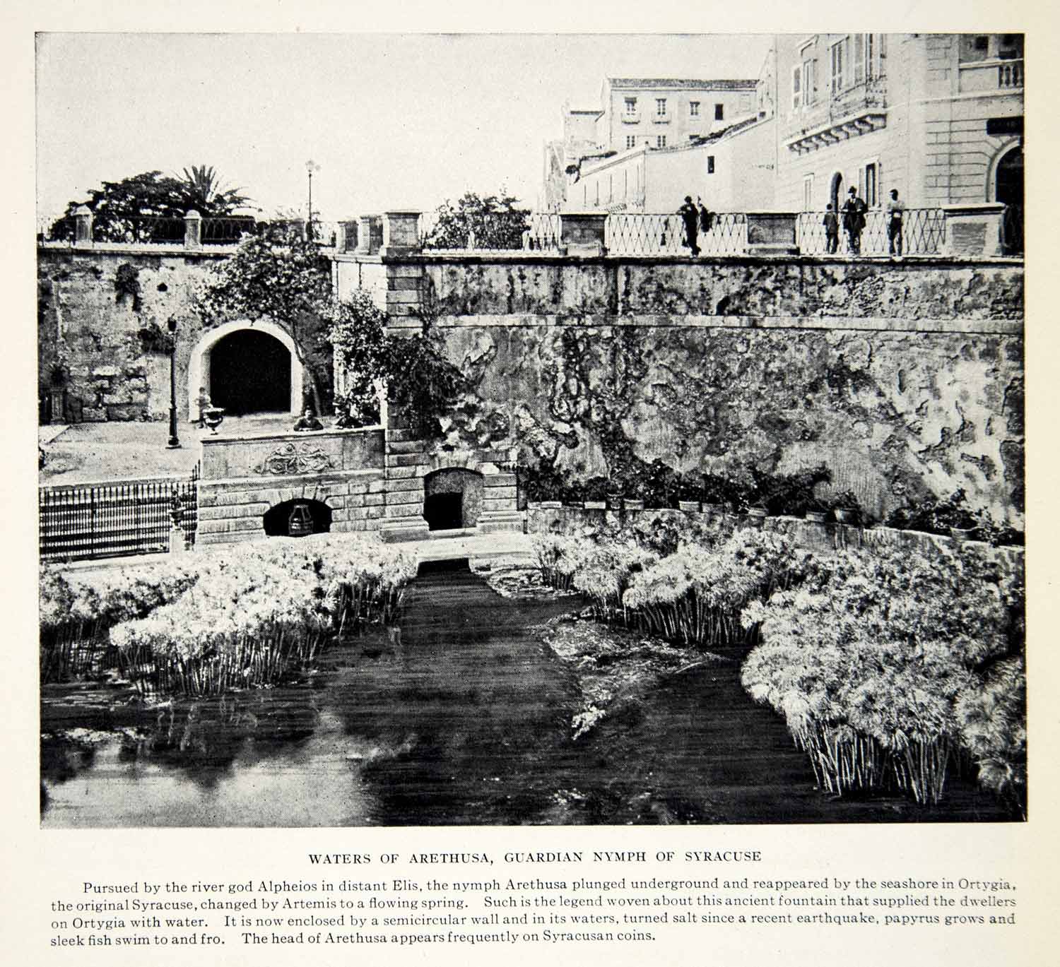This is an original 1924 black and white halftone print of the "Waters of Arethusa, Guardian Nymph of Syracuse."