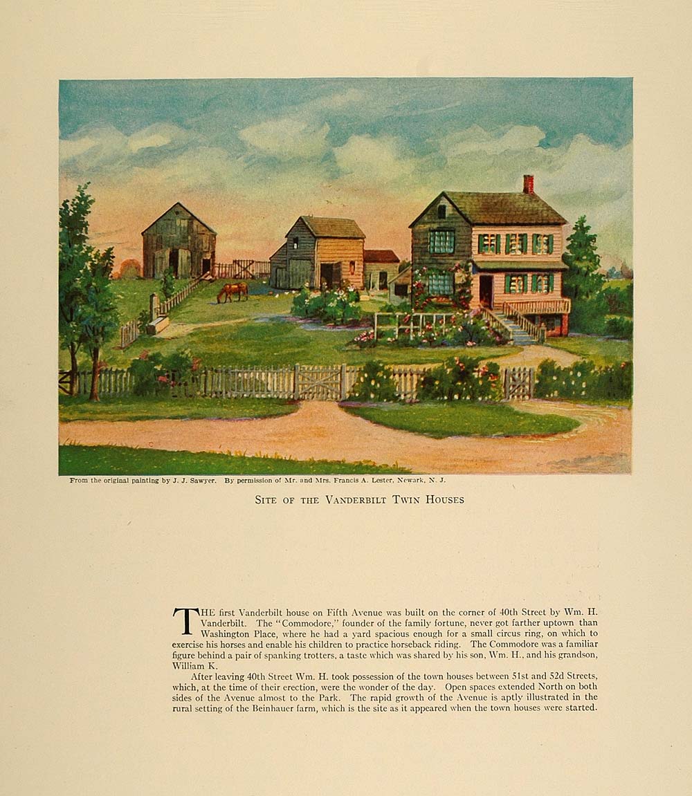 This is an original 1924 color print, from an painting by J. J. Sawyer, of the Beinhauer farm, which was the eventual site of two of the great Vanderbilt mansions on Fifth Avenue.