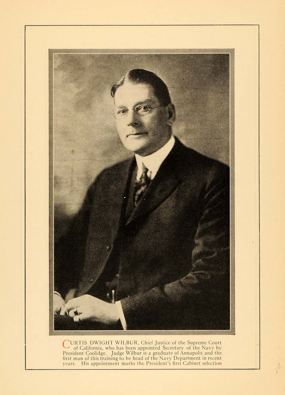 This is an original 1924 halftone print for Curtis Dwight Wilbur who was the Chief Justice of the Supreme Court of California and also was appointed Secretary of the Navy by President Coolidge. He graduated from Annapolis and was the first man of this training to be head of the Navy Department in recent years.