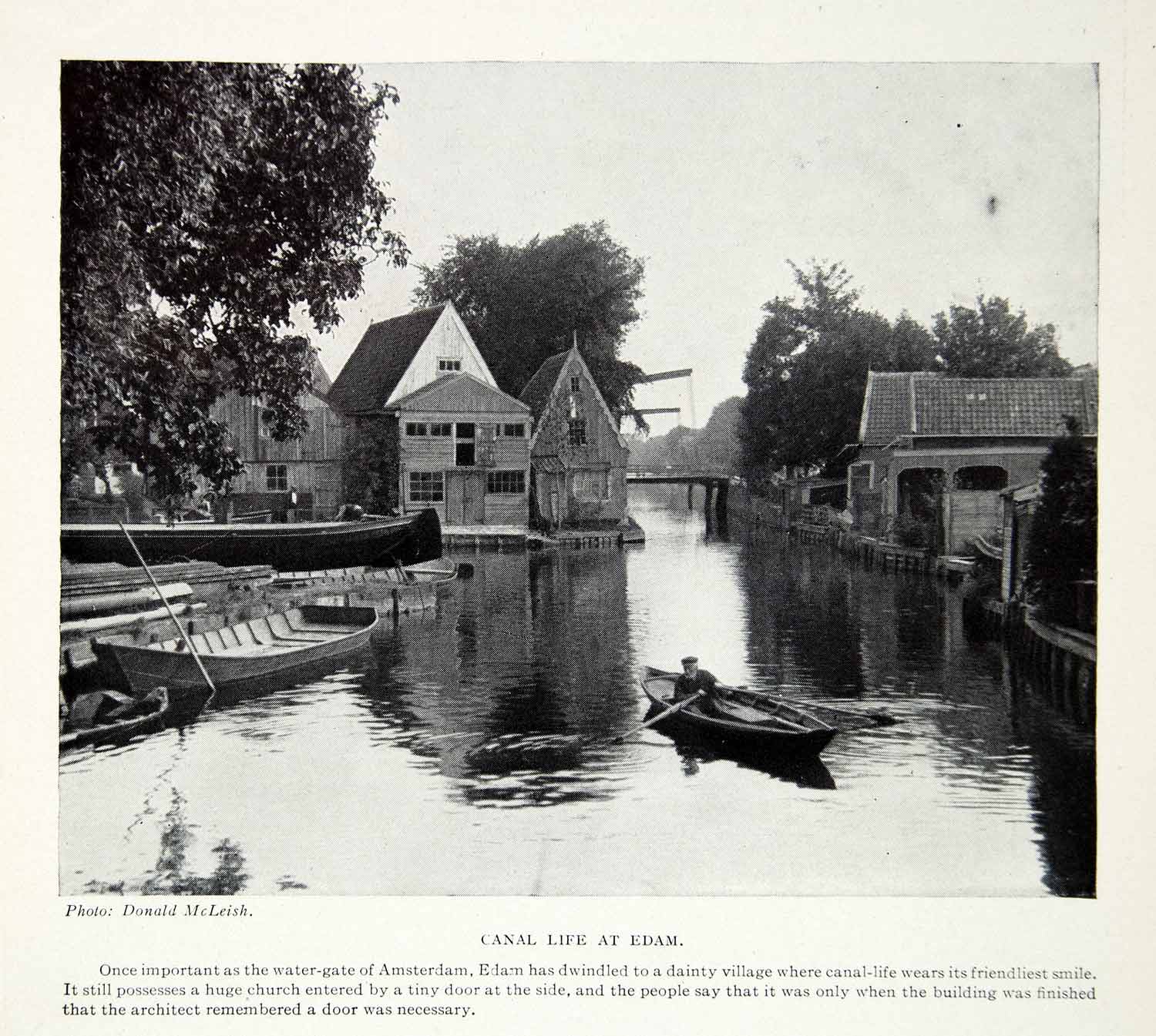 This is an original 1924 black and white halftone print of the historic cityscape of Edam, Holland, Netherlands, Europe. The town is also famous for the cheese produced there of the same name.