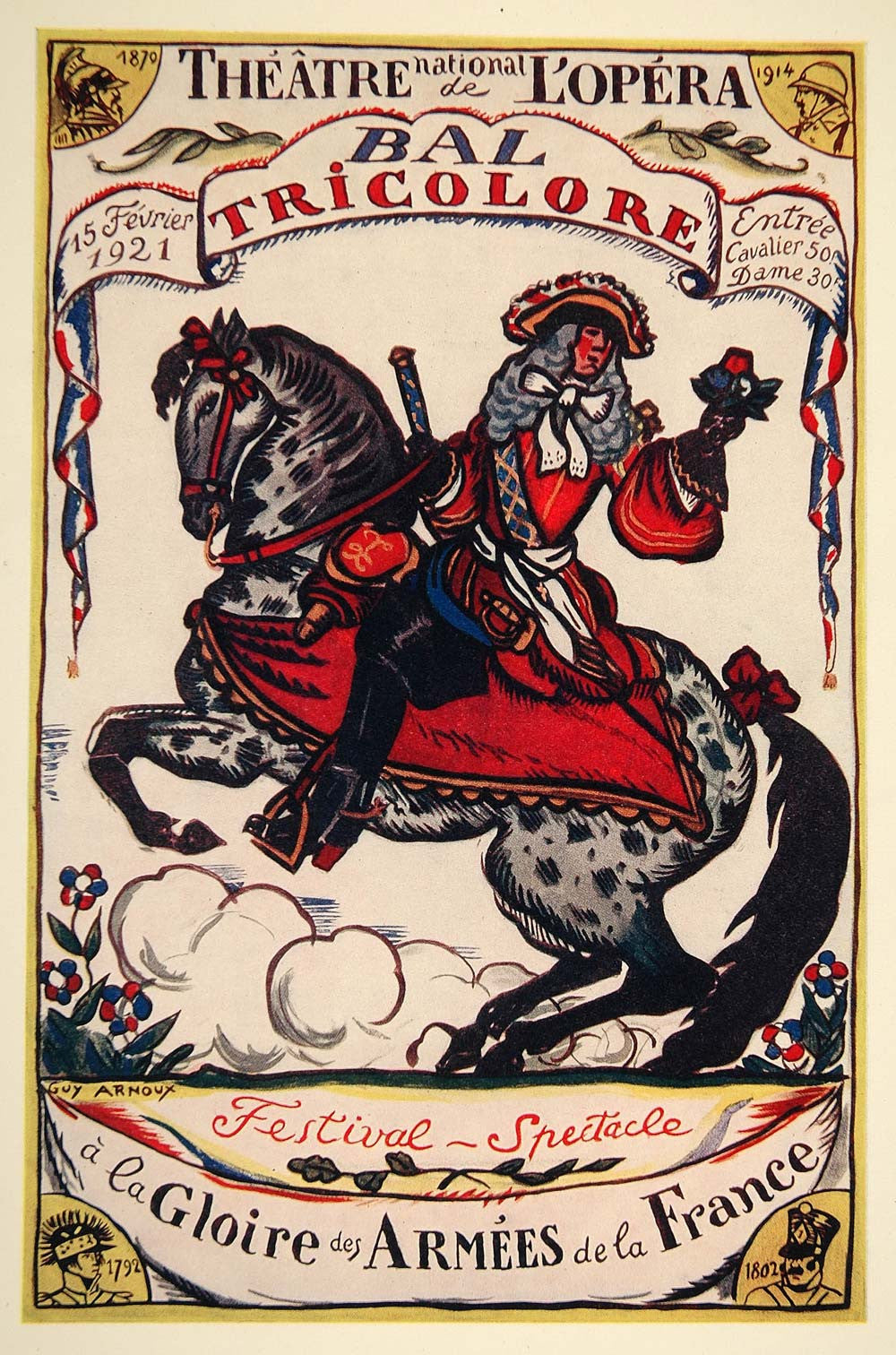 This is an original 1924 color print of a theatrical poster, designed by Guy Arnoux in 1921, advertising the Theatre National de L'Opera's "Bal Tricolore."