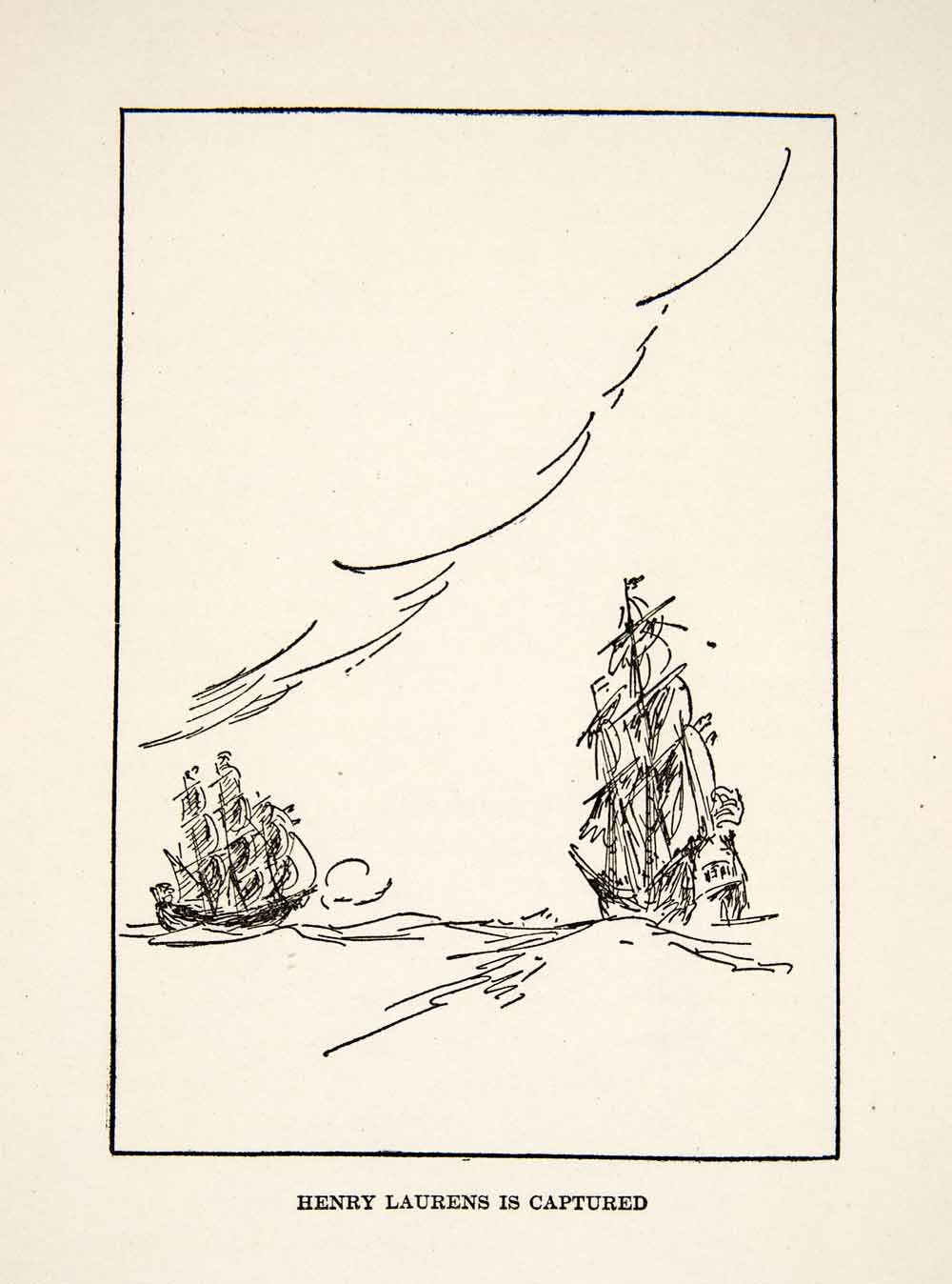 This is an original 1924 black and white relief line-block print of "Henry Laurens is Captured." The Congress of the United States named Laurens minister to the Netherlands in the fall of 1779. In that role, Laurens successfully negotiated Dutch support for the United States in the Revolutionary War. Upon his return voyage to Amsterdam, the British Navy intercepted his ship off the banks of Newfoundland.
