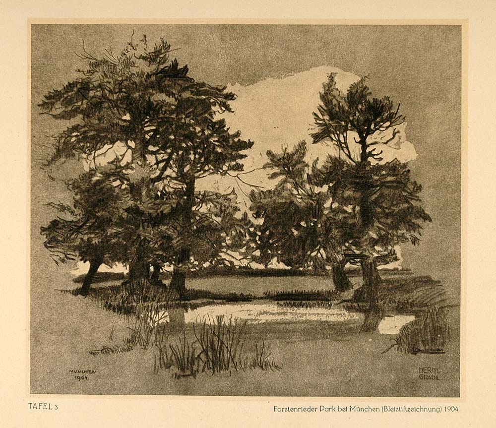 This is an original 1924 print of a pencil drawing of Forstenrieder Park near Munich by German artist, Hermann Gradl (1883-1964).