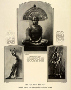This is an original 1924 halftone print of Kyra, Nyota Inyoka and Ragini Devi. One of the captions writes, "Princess Nyota Inyoka whose bronze and sculptural little figure is not always as immobile as in this charming moment of idolatry. Of the royal blood of the East, her artistic dance recitals have struck rich notes of beauty and authority."