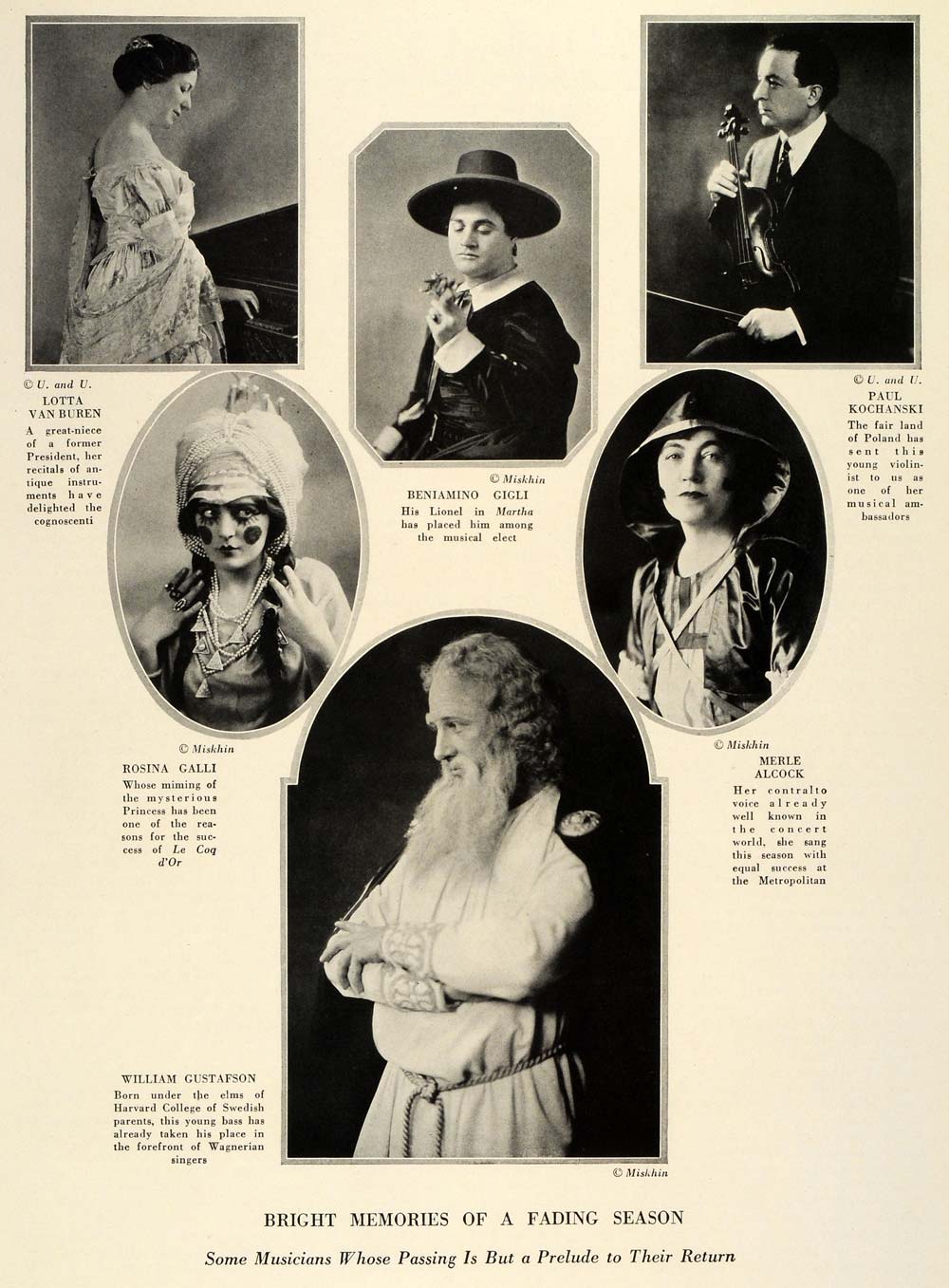 This is an original 1924 halftone print of various musicians including Lotta Van Buren, Beniamino Gigli, Paul Kochanski, Merle Alcock, Rosina Galli and William Gustafson. Photography by Mishkin.
