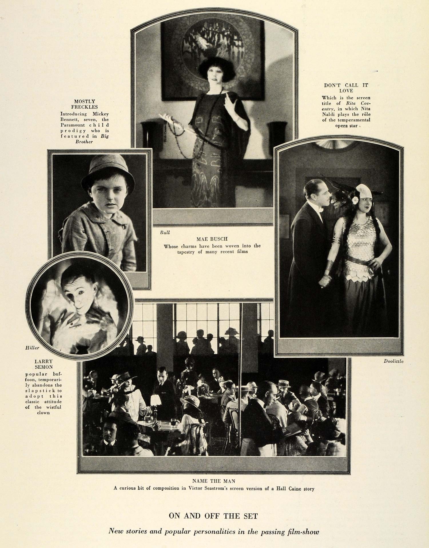 This is an original 1924 halftone print of seven-year-old Mickey Bennett, Mae Busch, Nita Naldi, and Larry Semon. Larry Semon was an American actor, producer, and director during the silent film era. He is remembered for working with Oliver Hardy and Stan Laurel, and for directing the 1925