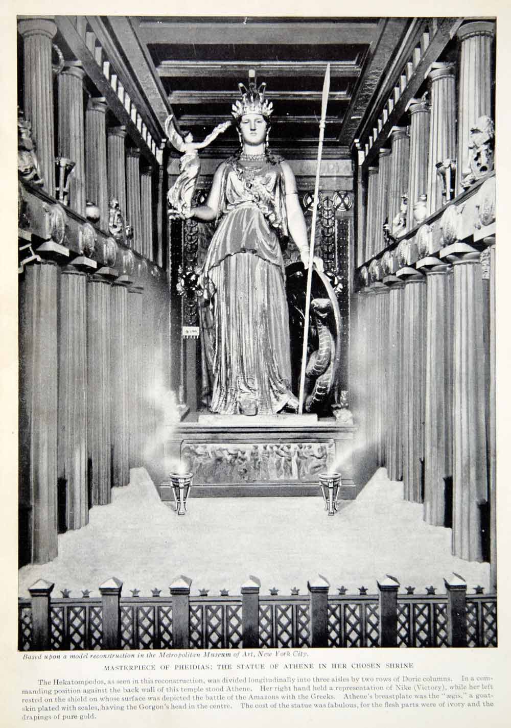 This is an original 1924 black and white halftone print of the "Masterpiece of Pheidias: The Statue of Athene in Her Chosen Shrine."