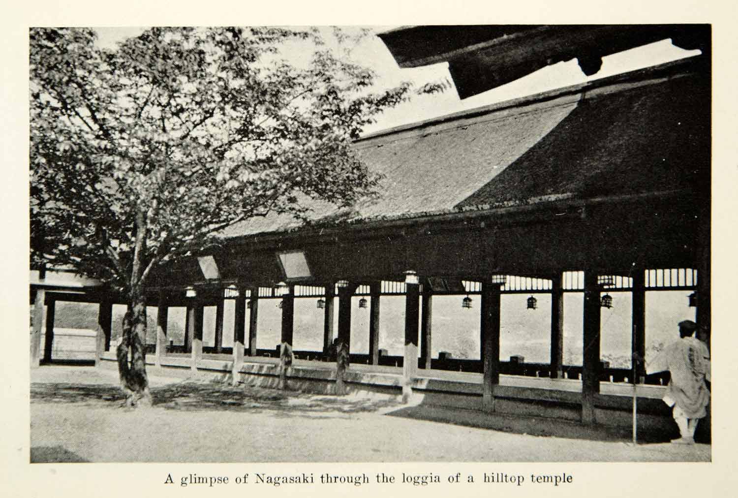 This is an original 1924 monochrome halftone print of view of Nagasaki through the loggia of a hilltop temple in Japan.