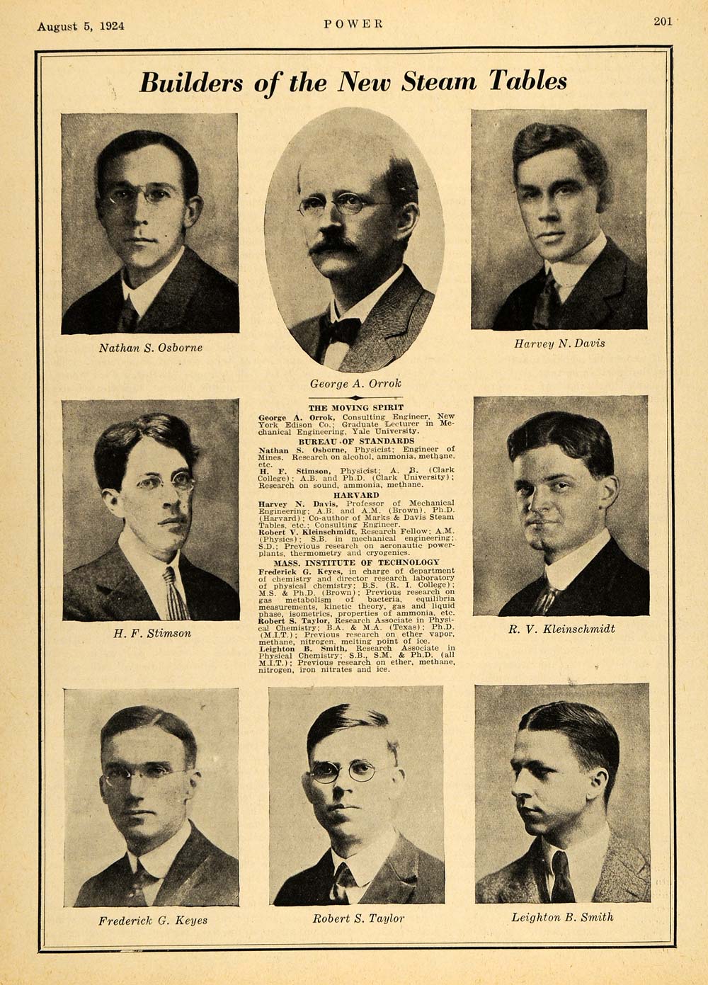 This is an original 1924 halftone print featuring the Builders of the New Steam Tables: Nathan S. Osborne, Harvey N. Davis, George A. Orrok, H. F. Stimson, R. V. Kleinschmidt, Frederick G. Keyes, Robert S. Taylor and Leighton B. Smith.