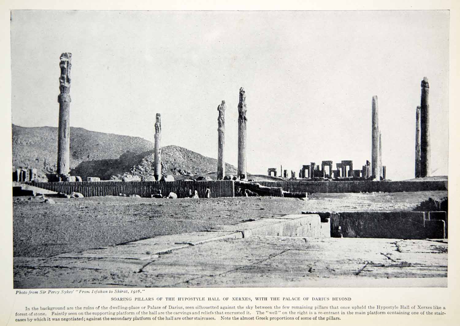 This is an original 1924 black and white halftone print of "Soaring Pillars of the Hypostyle Hall of Xerxes," with the Palace of Darius beyond.
